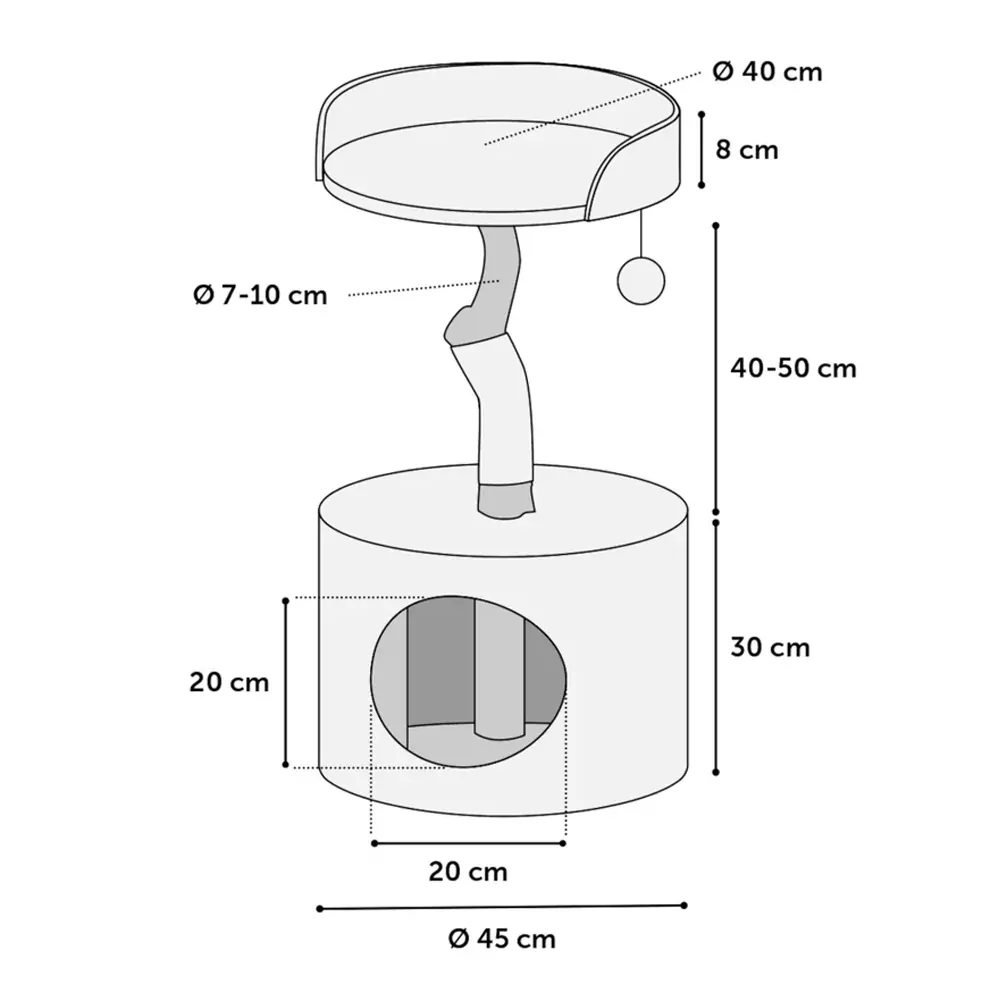 De krabpaal heeft een hoogte van ongeveer 81 centimeter. Het huisje heeft een afmeting van 45 x 45 x 30 centimeter (L x B x H). Het ligplateau heeft een diameter van 40 centimeter en een hoogte van 8 centimeter. De paal is tussen de 7 en 10 centimeter dik.