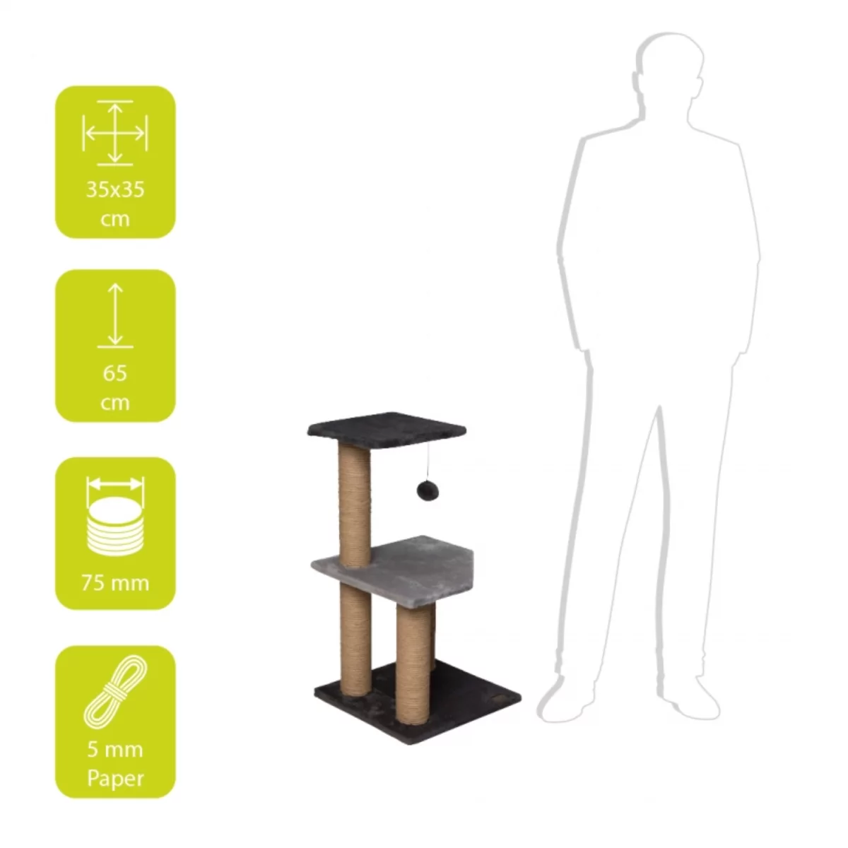 De krabpaal heeft een hoogte van 65 centimeter. De bodemplaat heeft een afmeting van 35 x 35 centimeter (L x B). De sisalpalen hebben een diameter van 7.5 centimeter.
