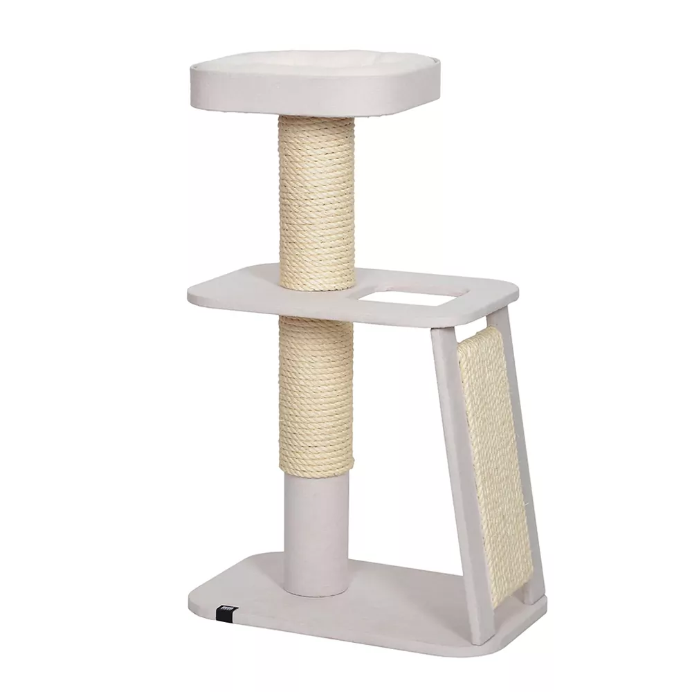 Deze simplistische en prachtige krabpaal is ontworpen met het Japanse zen-concept als inspiratiebron. Hierdoor sluit deze krabpaal fantastisch aan bij een hedendaags interieur. De Miyato krabpaal is uiteraard niet alleen mooi, maar ook praktisch: hij voorziet de kat in de krabbehoefte en heeft ook een lekkere relaxmand. Deze relaxmand is voorzien van een comfortabel foam kussen, voorzien van teddy stof. De rest van de krabpaal is afgewerkt met interieur stof. Wat betreft de krabgedeeltes is overal aan gedacht: de krabpaal beschikt over een sisalpaal van 12 centimeter dik, en is voorzien van een verticale krabplank aan de zijkant. De Miyato heeft een afmeting van 56 x 36 x 91 centimeter (l x b x h), en is tevens verkrijgbaar in bruin.
