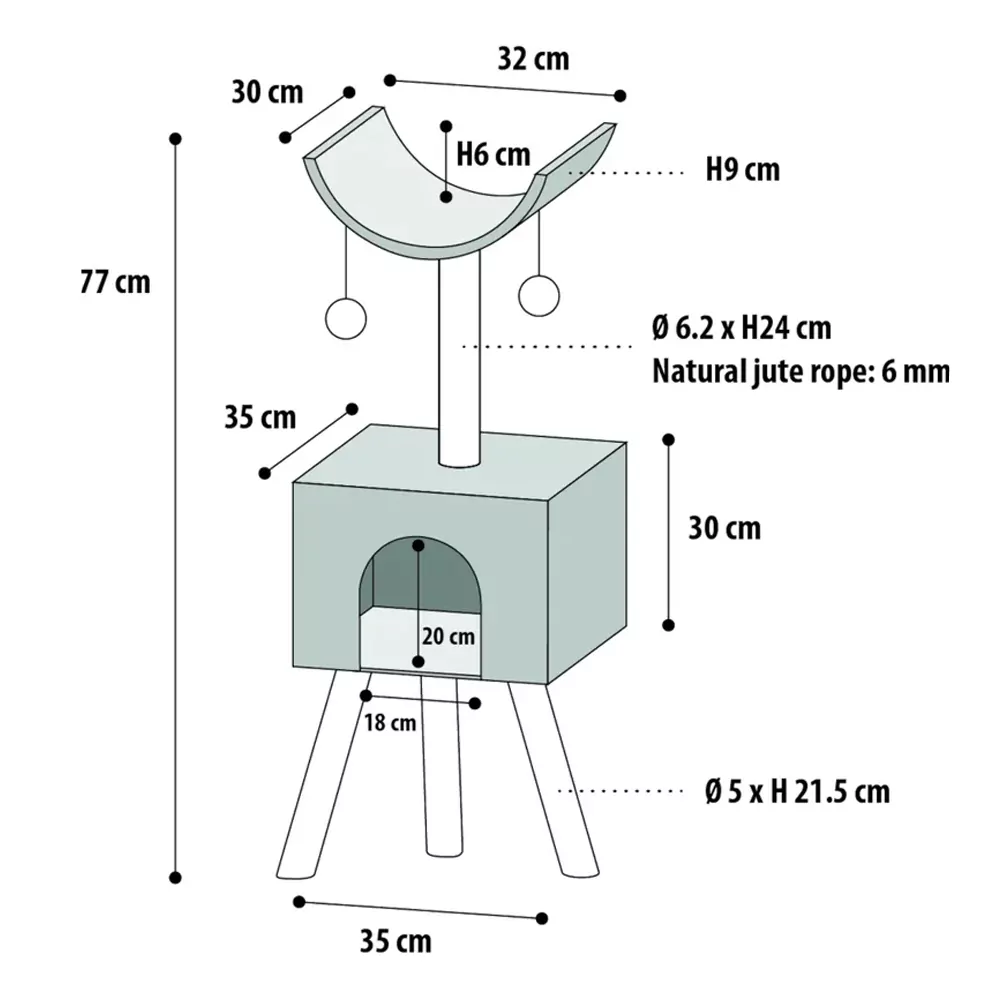 De krabpaal heeft een hoogte van ongeveer 77 CM. Het huisje heeft een afmeting van 35 x 30 CM. De poten onder het kattenhuis hebben een hoogte van 21.5 CM en zijn 5 CM dik. Het bovenste plateau heeft een afmeting van 30 x 32 CM. Door de kromming heeft het plateau een diepte van zo’n 6 CM. De sisalpaal tussen het slaaphuis en het slaapplateau in is 24 CM hoog en circa 6 CM dik.