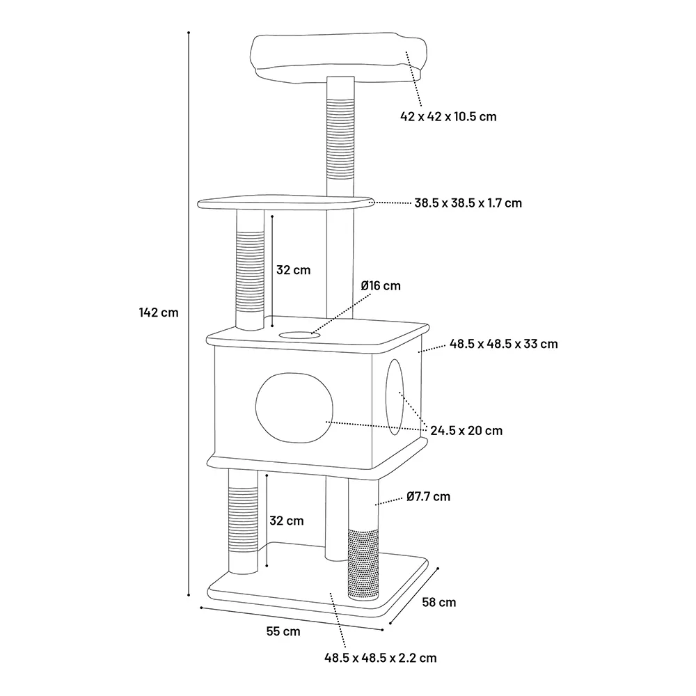 Deze leuke krabpaal heeft een eigentijds en praktisch ontwerp. Je kat kan hier terecht voor zijn krabbehoeftes, maar ook heerlijk slapen in het kattenhuis. Ook in de speelbehoefte wordt voorzien door het balletje (met belletje) in de bovenste paal. De platen en de mand zijn afgewerkt met zacht interieurstof. De sisalpalen zijn ca. 8 centimeter dik en voorzien van katoenen krabtouw. Eén van de onderste palen is voorzien van een massage borstel. De Teor krabpaal heeft een afmeting van ca. 55 x 58 x 142 centimeter (l x b x h).