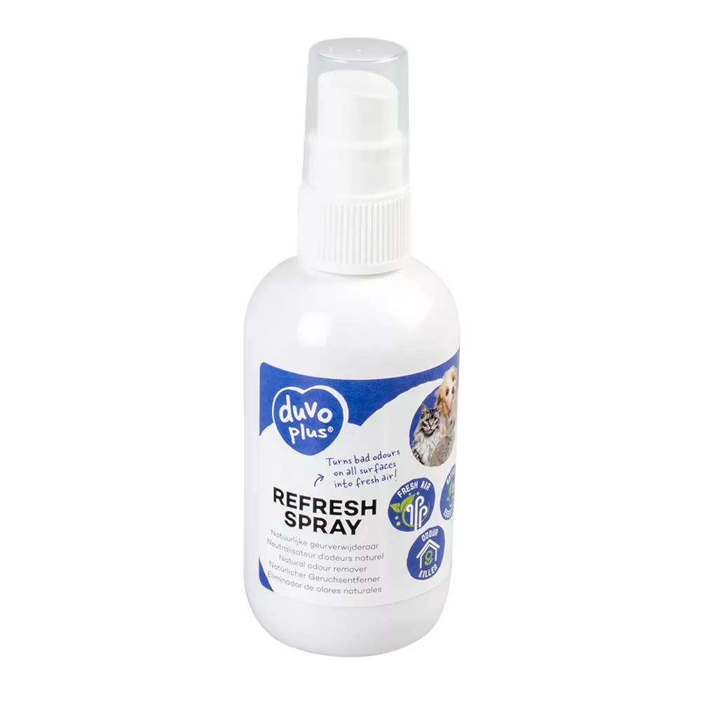 Deze handige spray helpt je een handje bij het maskeren van onaangename geuren die je kat achter kan laten. Het is gemaakt van natuurlijke ingrediënten en bevat geen schadelijke chemicaliën of parfums. De spray laat ook geen residu achter, en is hiermee veilig voor mens, dier en milieu. Je kunt de spray bijvoorbeeld gebruiken wanneer je kat een ongelukje op je meubels heeft gehad. De refresh spray is geschikt voor waterbestendige bekleding en stoffen, bijvoorbeeld op het tapijt, kussens, de autobekleding of de bank. Spuit nooit op dieren. De spuitflacon bevat 100 ml.